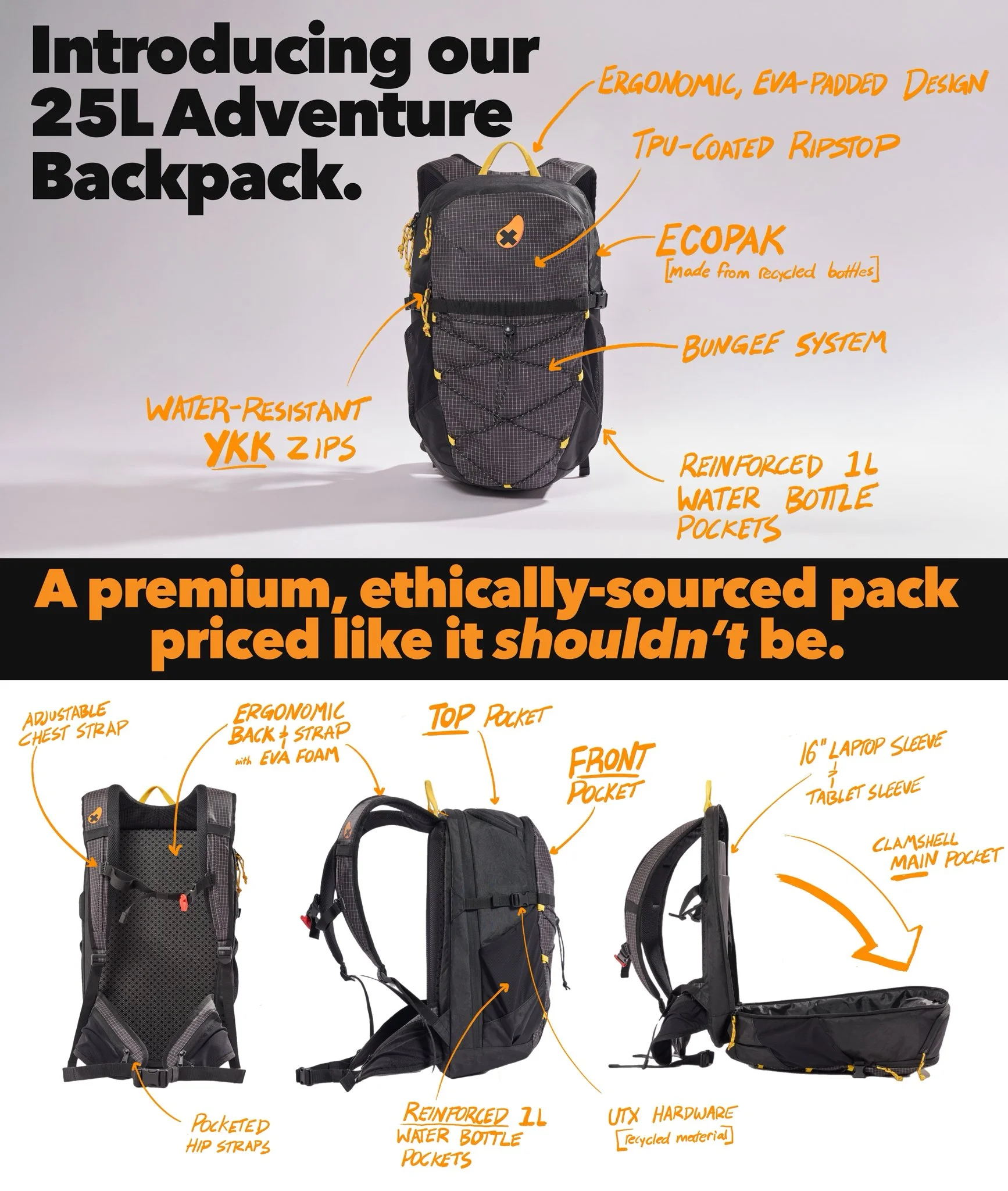 We use premium materials other brands charge hundreds of dollars for. ECOPAK from recycled bottles, TPU-coated ripstop, and long lasting EVA-foam